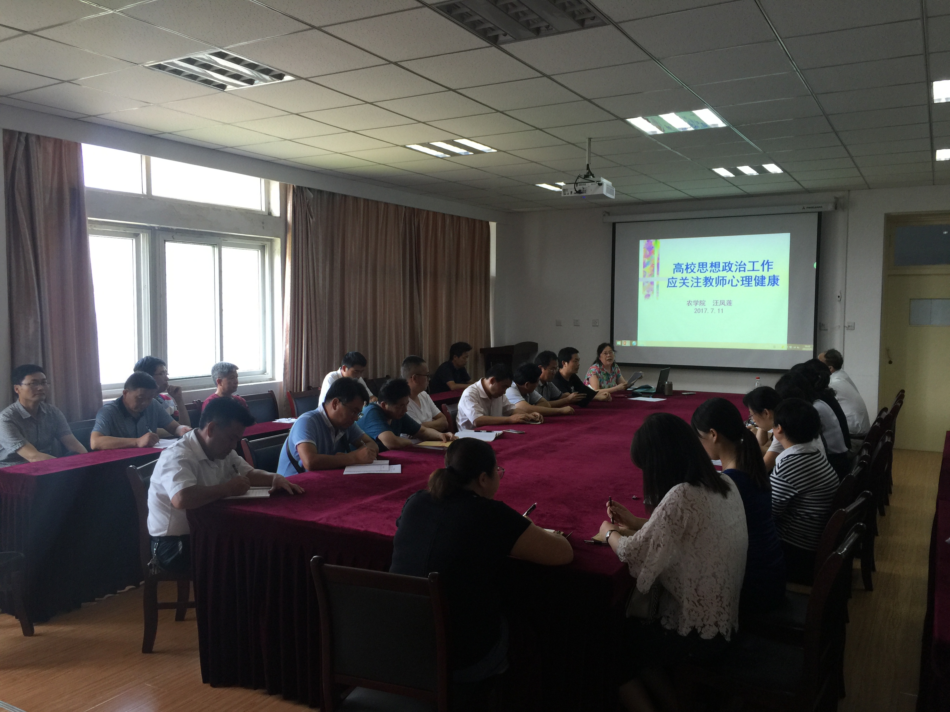 本网讯 为了贯彻落实全国全省思想政治工作会议精神,7月11日下午,院党委书记汪凤莲同志在十教518为全体党员、教职工讲授题为《高校思想政治工作应关注教师心理健康》党课。