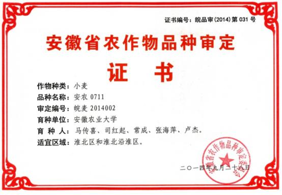 2017年6月4日,涡阳县楚店镇后水坡村张子富户千亩连片安农0711实产验收,实收3.51亩,平均亩产1511斤。