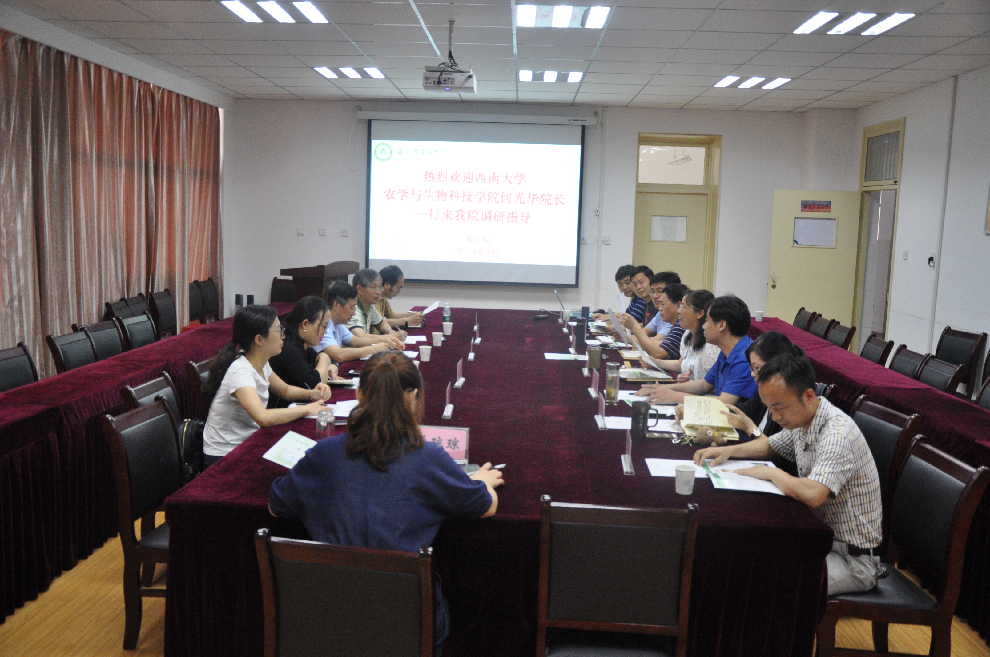 本网讯 5月17日,西南大学农学与生物科技学院院长何光华一行5人到我院进行考察交流。在十教518室,学院党政领导、系部主任及办公室人员与何光华一行进行了座谈交流。